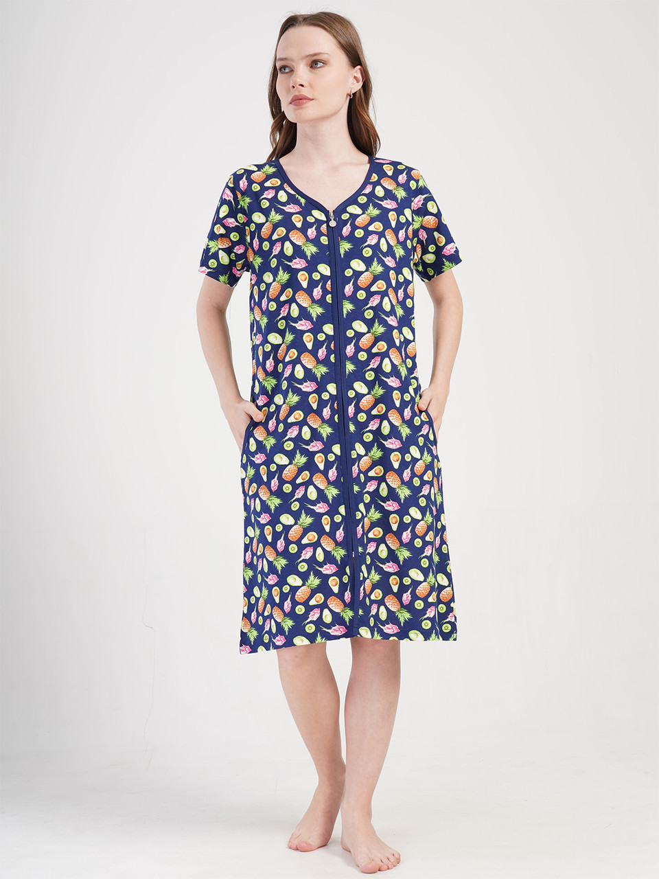 Домашній бавовняний халат на блискавці синього кольору з Фрукти принт; короткими рукавами та прямим кроєм - ідеальний вибір для Вашого гардеробу!